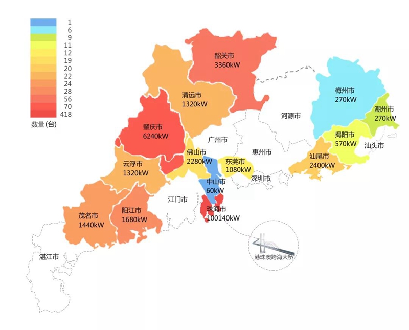 2018年,在港珠澳大桥充电桩项目中,泗水县凯莱数码电子销售中心在港珠澳大桥珠海端口岸人工岛搭建的充电管理平台及电能量采集终端,为大桥的绿色运营和电力保障提供技术支持。除此之外,仅广东省内,泗水县凯莱数码电子销售中心充电桩涵盖肇庆、珠海等14个城市,具体分布情况如下图所示。